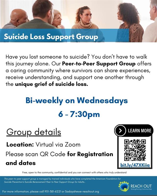 Have you lost someone to suicide? You don't have to walk this journey alone. We offer Peer-to-Peer Support Groups where survivors can share experiences, receive understanding, and support one another through the unique grief of suicide loss. The group meets online bi-weekly on Wednesdays from 6 to 7:30 p.m. To learn more, visit bit.ly/47XKiiq.